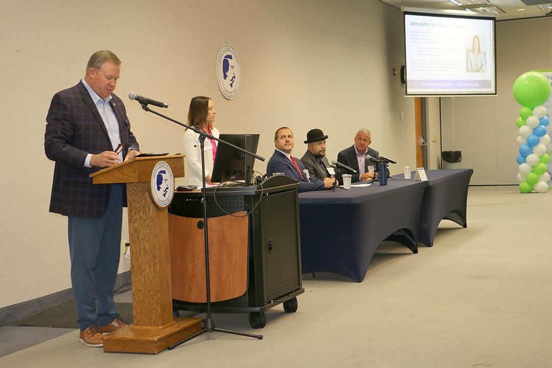 The Southern Illinois Workforce Development Board and Man-Tra-Con Corporation would like thank everyone who attended the 2025 Workforce Summit: Employer-Driven Solutions. The all-day summit was held at John A. Logan College in Carterville, Illinois, on Wednesday, October 1, 2025. Our fourth annual workforce summit featured national speakers, local employer panel discussions, plus representatives from education, employment, government, healthcare, and manufacturing. Over 120 people attended the event. Photos shown at right highlight the event. Presentations included the following: